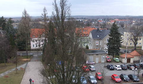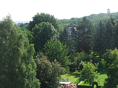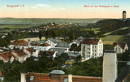 Schaut man nach Osten, so sieht man den ehemaligen Bahnhof und den Wasserturm im Wettinhain. Heute ist auf Grund des dichten Bewuchses nur noch der Aussichtsturm zu sehen. |