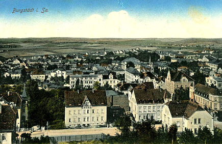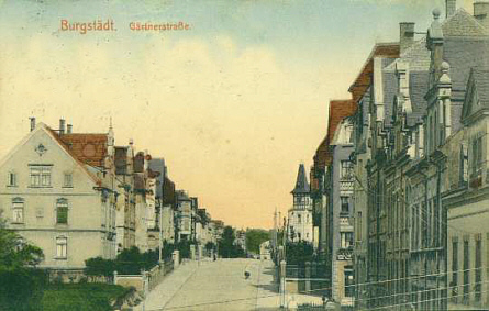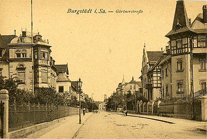 | Nach dem Überqueren der Chemnitzer Straße fällt unser Blick auf das Eckhaus, worin sich heute im Erdgeschoss ein Fachgeschäft für Pferdesportartikel befindet. Zwischen den beiden Häusern ist im Hintergrund die ehemalige Burgstädter Brauerei zu sehen, auf deren Gelände nach dem Abriss heute eine Anlage für betreutes Wohnen angelegt wurde. | ||