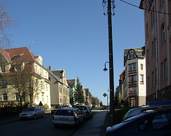 | Gehen wir nun die Schillerstraße weiter bis zur Chemnitzer Straße, so bietet sich uns dieser Ausblick, wenn wir uns kurz vor der Einmündung noch einmal umdrehen. | ||