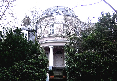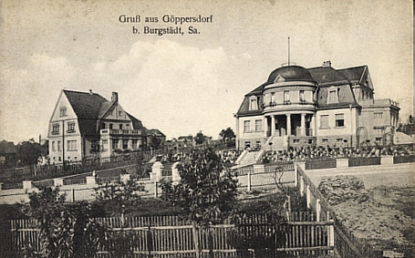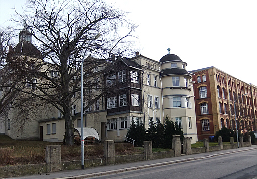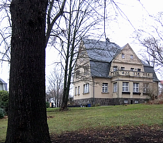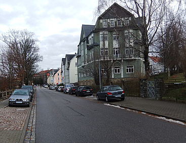 | Ein paar Schritte weiter zweigt die Franz-Schubert-Straße nach links ab. Gleich zu Beginn stehen links zwei Villen. In der linken Villa war zur sozialistischen Zeit ein Kindergarten untergebracht. Die rechte Villa war die Wohnstätte von Eidners, den Eigentümern der gleichnahmigen Textilfabrik. Beide Grundstücke sind heute stark begrünt, so dass ein freier Blick auf die Häuser nicht mehr möglich ist. | ![]() |