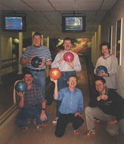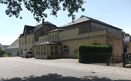 | Früher ein beliebter Ballsaal, diente dieser in der DDR-Zeit als Kino. Nach 1990 wurden die Räumlichkeiten in eine Bowlinggaststätte umgebaut. Heute ist der ganze Komplex geschlossen, lediglich eine marode Kegelbahn ist im Keller noch in Betrieb. Rechts bowlte der Stammtisch "Die Elektromeister", als die Bahn noch in Betrieb war. | ![]() |