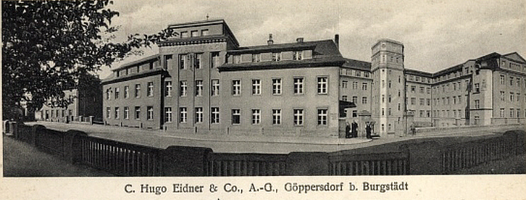 | Wenige Schritte stadtauswärts weiter gelangt man rechterhand an die ehemalige Textilfabrik Eidner, in den späteren Jahren zum VEB Textilwerke Clara Zetkin umgewandelt (auf der Postkarte rechts unten, die weiteren Bilder werden an anderer Stelle unserer Wanderung betrachtet). | ||