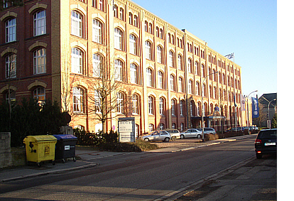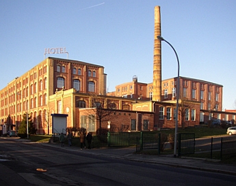 | Nach ein paar weiteren Metern Fußweg erreichen wir das Hotel "Alte Spinnerei", welches nach 1990 aus der ehemaligen Baumwollspinnerei Köpke bzw. dem VEB Feinspinnerei entstanden ist. Auf dem Gelände hinter der "Alten Spinnerei" wurde nach 1995 ein Einkaufszentrum mit einem Supermarkt errichtet. Die Villa im Vordergrund beherbergte viele Jahre lang eine chirurgische Arztpraxis, die jedoch wegzog. |