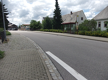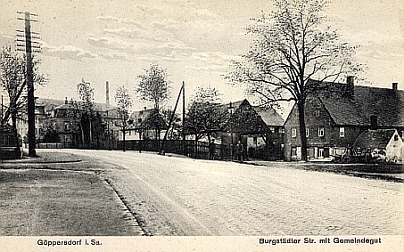 | Unser Blick geht vom Erbgericht stadtauswärts. Früher befand sich auf der rechten Seite des Weges das Gemeindegut Göppersdorf. Die Gebäude stehen heute zum großen Teil nicht mehr. Links zweigt die Köbkestraße ab. | ||