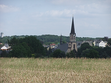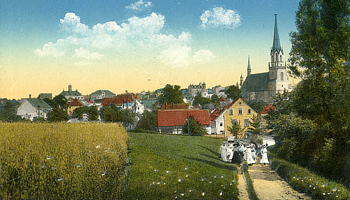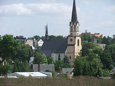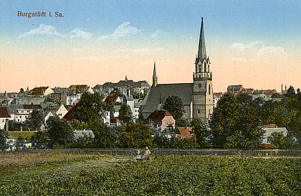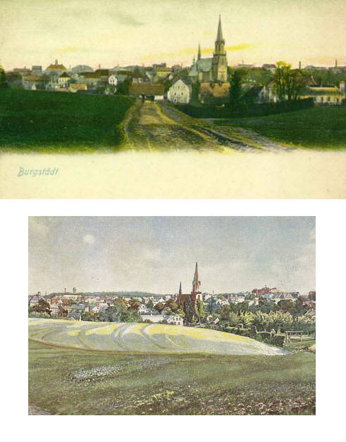 | Wenn wir die letzten Häuser hinter uns gelassen haben und uns wieder der Stadt zuwenden, bietet sich dieser wunderschöne Blick auf Burgstädt mit seinen Wahrzeichen: Rathaus, Taurasteinturm, Stadtkirche und Gymnasium. | ||