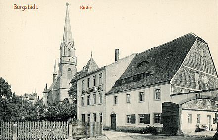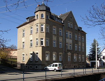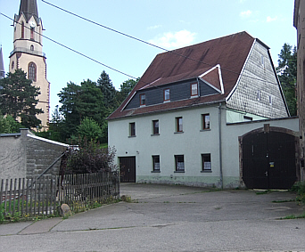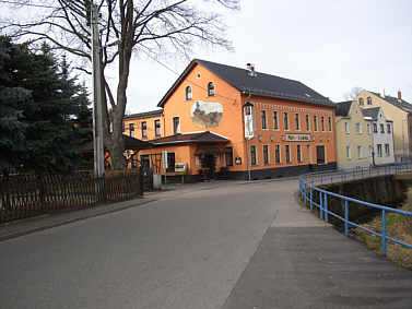 | Wieder auf Burkersdorfer Flur gelangen wir zur ehemaligen Gaststätte "Gambrinus". Heute befindet sich in dem Haus das ungarische Spezialitätenrestaurant "Pari Csarda" mit einem sehr schönen Biergarten. Auf der Postkarte oben ist auch das ehemalige Burkersdorfer Rathaus zu sehen (rechtes Foto), welches sich jedoch noch ca. 2 Kilometer weiter dorfabwärts befand und zuletzt Wohnungen beherbergte. Nach langem Leerstand fiel es 2016 der Abrissbirne zum Opfer. | ![]() |