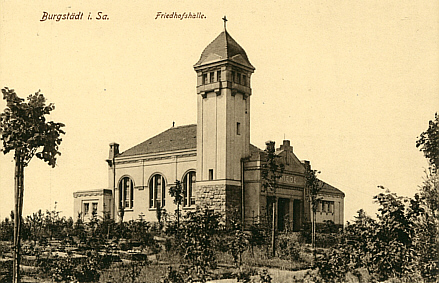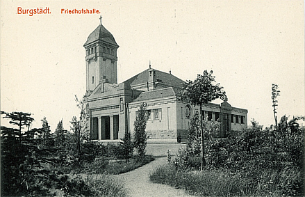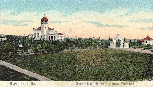 | Nach einem Fußweg von ca. 400 m zweigt links die Straße zum Waldfriedhof Burgstädt ab. Das Gelände des Friedhofes ist heute dicht bewachsen. | ||