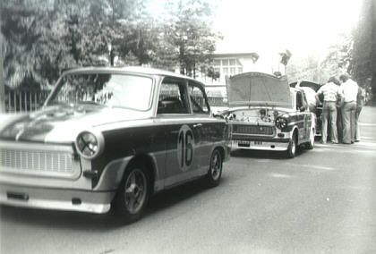 im Vordergrund links: Rennfahrerlegende Helmut Aßmann | Die Trabis von Uwe Heinz - 16 und Jürgen Grebhahn - 41 - A 21 bis 600 ccm | |