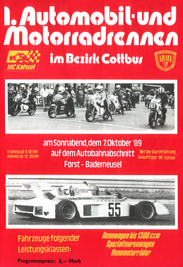 | In den Jahren 1989 und 1990 fand unter der Regie des Motorsportclubs Kahsel auf einem Streckenabschnitt der Autobahn A 15 Cottbus - Forst im Abschnitt zwischen den Anschlussstellen Forst und Bademeusel ein Flachbahnrennen für Motorräder und Automobile statt. Die Rennfahrzeuge wurden dabei einzeln auf einer ca. 3 Kilometer langen Strecke gestartet (wie bei einem Bergrennen) und die erreichten Zeiten zweier Wertungsläufe addiert. Um den Streckenverlauf interessant zu gestalten, waren drei Schikanen eingebaut. Nach der zweiten Veranstaltung 1990 liesen es die nunmehr geltenden Vorschriften der Bundesrepublik Deutschland nicht mehr zu, weitere Rennveranstaltungen durchzuführen. |