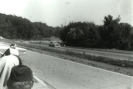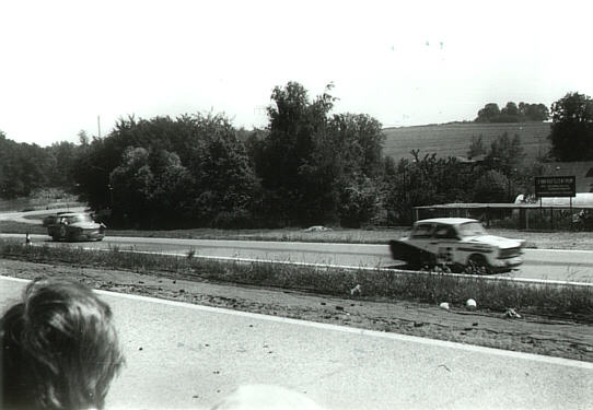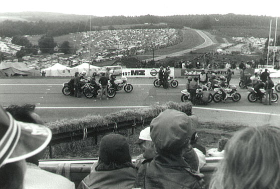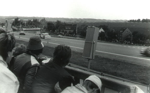 | 1984 war der Autor beim Sachsenringrennen dabei. Der Standort ist ausgangs der MTS-Kurve. Die alte Rennstrecke führte parallel zur Autobahn (jetzt A 4) entlang. Also wurde durch die Polizei kurzerhand die Richtungsfahrbahn Dresden gesperrt, damit die Zuschauer Platz fanden. Auf Campinghockern wurden schließlich die Rennen verfolgt. Wie der Betrachter feststellen kann, fehlte es an jeglichen Sicherheitseinrichtungen. Man saß praktisch fast im Straßengraben. Allerdings kam es auch in diesem Bereich zu schweren Unfällen, weil die Wagen teilweise ungebremst bis auf die Autobahn in die Zuschauer abflogen. |